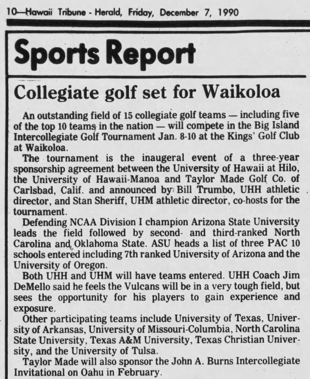 The Spring portion of the 1990-91 season began early for many of the top men’s collegiate golf teams in the country, but nobody was complaining about spending January on the Big Island of Hawaii. In the previous couple of years TaylorMade had spun up a collegiate program which committed a fair bit of money sponsoring some collegiate tournaments including the Red River Classic (co-hosted by Texas and Oklahoma). In 1990, Hawaiian newspapers announced a new tournament sponsored by TaylorMade that would be co-hosted by two of the branch campuses of the University of Hawaii system: the D1 Manoa campus (generally just referred to as “Hawaii”) and the D2 Hilo campus (known as “UH-Hilo”). With a D1 school as a co-host, other D1 programs were able to count this as an official event. Thus the “TaylorMade Big Island Intercollegiate” was inaugurated in January 1991 and attracted some of the highest ranking teams in the country right from the start.