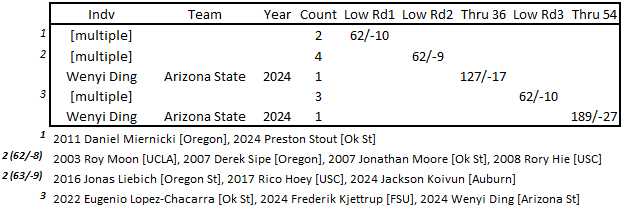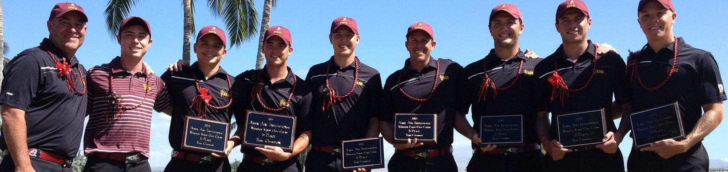 Since the addition of match play to decide the NCAA team championship, three Amer Ari team champs - 2018 Ok St, 2019 Ok St, and 2021 Arizona St - have gone on to earn the #1 seed at NCAAs. That’s a cool stat, but what’s even more impressive is that since that format change in 2009 **at least one team from the Amer Ari field every year has gone on to make the match play portion of NCAAs! The average number of teams each year is about 3, with the most being in 2010 when seven of the eight match play teams had competed in Hawaii a few months prior; the only team not at Amer Ari was Augusta who ended up winning the first of their two consecutive NCAA championships.