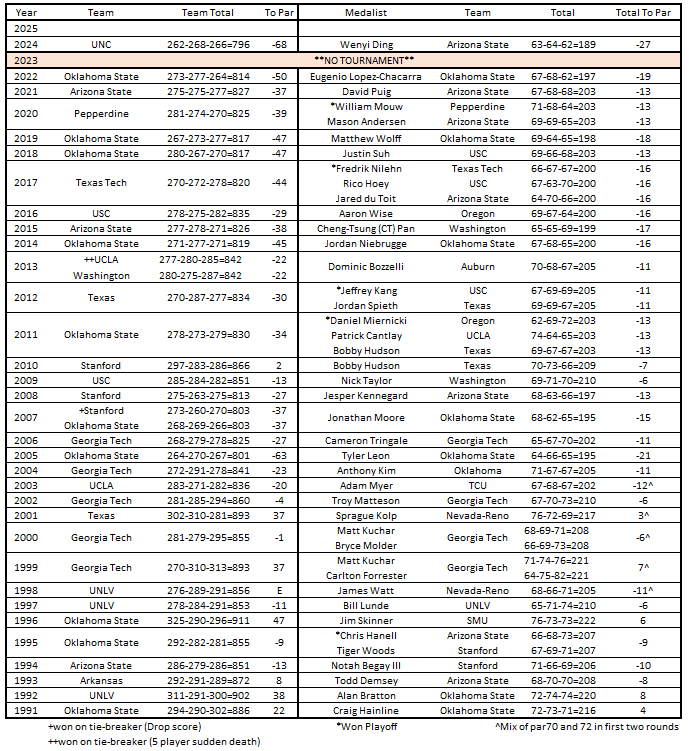 Any tournament with a field perpetually this strong is going to have a great connection to the NCAA championship. In fact, six teams - 1991 Oklahoma St, 1995 Ok St, 1998 UNLV, 2007 Stanford, 2012 Texas, and 2018 Ok St - have won the NCAA championship just a few months after taking home the Amer Ari team title. Furthermore, four players have won both Amer Ari and NCAA medalist honors in the same season: 1993 Todd Demsey [Arizona St], 2002 Troy Matteson [Georgia Tech], 2016 Aaron Wise [Oregon], and 2019 Matt Wolff [Ok St].