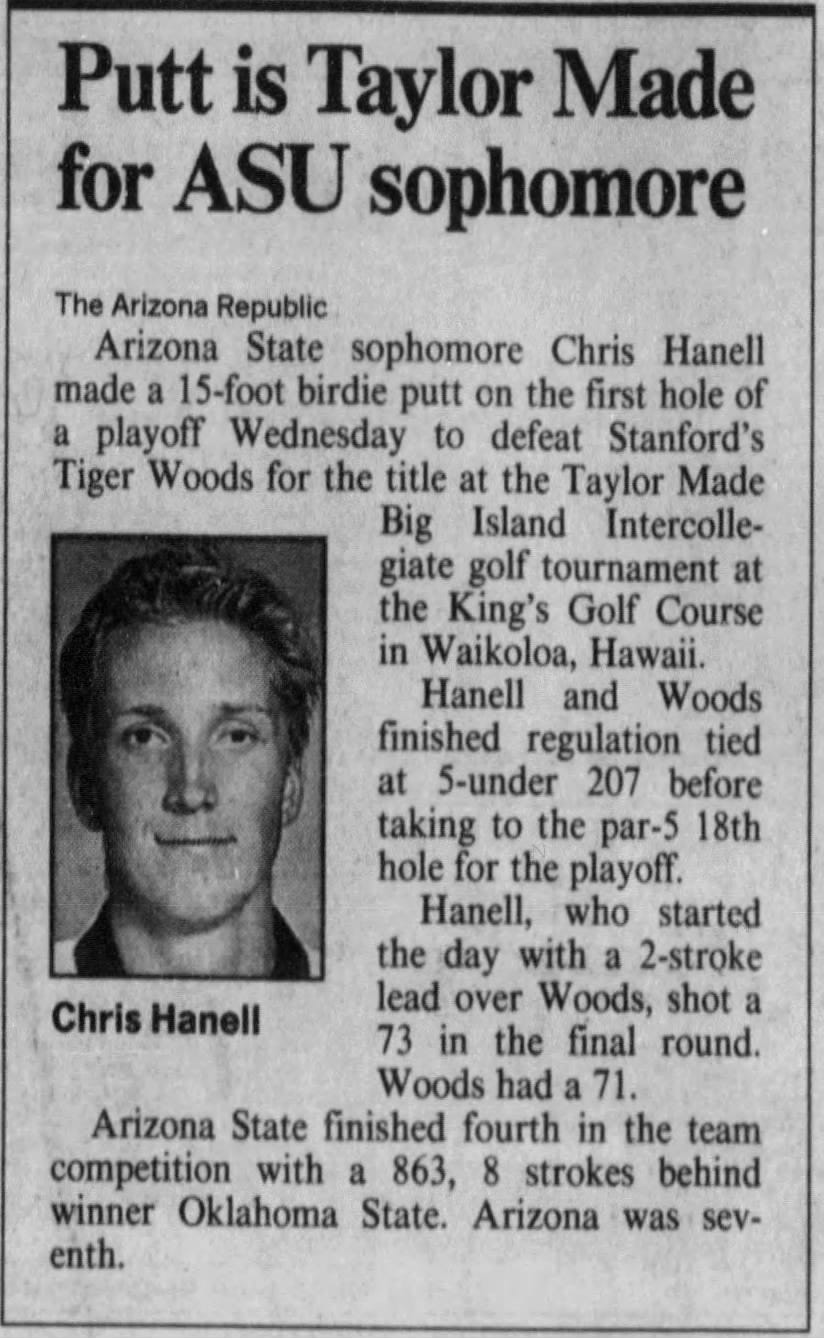 This year marks the 30th anniversary of an epic Amer Ari where Tiger Woods did something he didn’t often do: lose. The superstar Stanford freshman made up a two stroke deficit in the final 18 holes to catch Arizona State sophomore Chris Hanell, but lost to a 15-foot birdie on the first sudden-death playoff hole. Oklahoma State, led by senior Alan Bratton and Trip Kuehne who both finished T4, took home the “Big Island Intercollegiate” team title and would go on to defeat Stanford a few months later for the NCAA team title in another dramatic playoff.