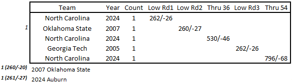 On the team side, UNC blitzing both the tournament and school record books. The Tar Heels opened with an incredible 26-under-par 262 on the back of David Ford’s 64 as well as 65s from his brother Maxwell and Dylan Menante. Auburn broke that single-round tournament scoring record in round 2 with a 27-under 261, led by a Jackson Koivun’s 63. In the final round, Georgia Tech tied a potential national record when their drop score came in at 5-under 67 on their way to a 265/-23 finish. In the end, UNC finished at 68-under par (796) for a five stroke victory over Arizona State.